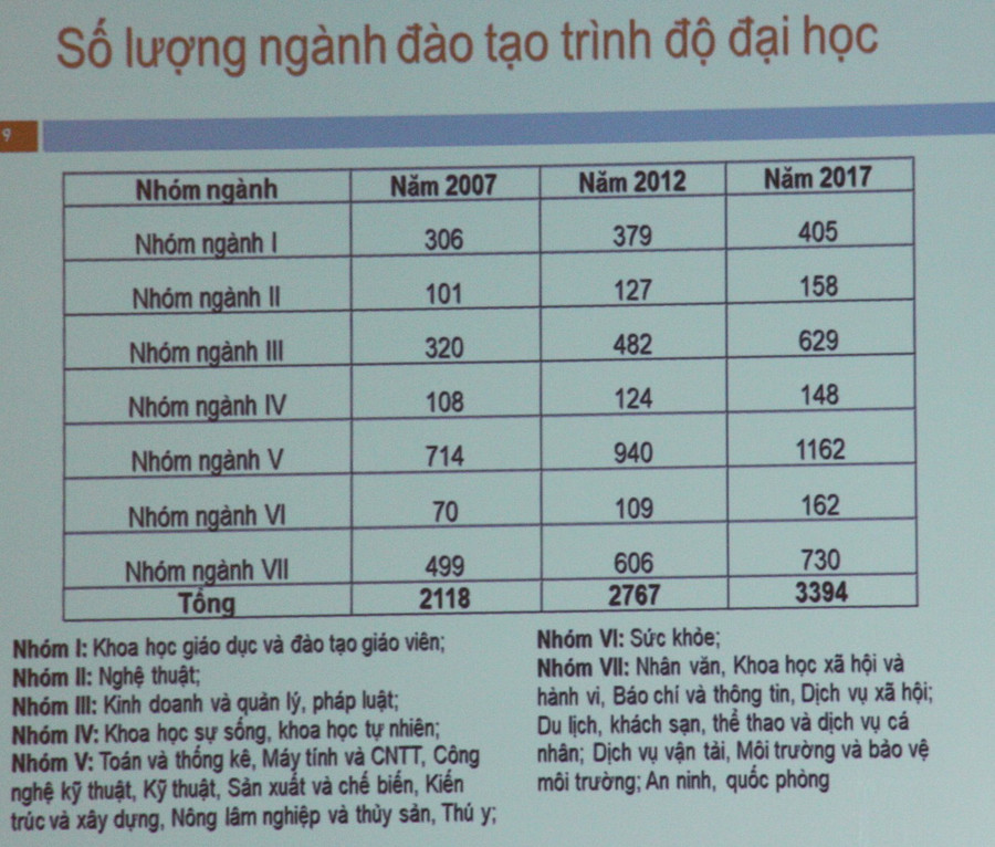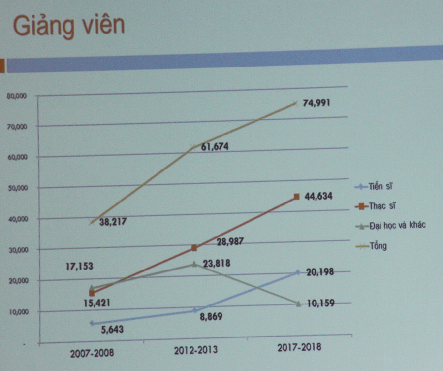 Hiện nay, cả nước có 236 trường đại học, học viện và 41 viện nghiên cứu khoa học được phép đào tạo trình độ tiến sĩ. Số sinh viên học trong các trường đại học là 1.439.495 em, chiến 84%; số sinh viên ngoài công lập là 267.530, chiếm 16%. Số lượng giảng viên ĐH tăng nhanh trong thời gian vừa qua, trong đó có số giảng viên đạt trình độ tiến sĩ. Số lượng ngành trình độ đào tạo đại học cũng tăng, từ 2.118 năm 2007 lên 3394 năm 2017. Số lượng chương trình đào tạo đại học cũng tăng mạnh.