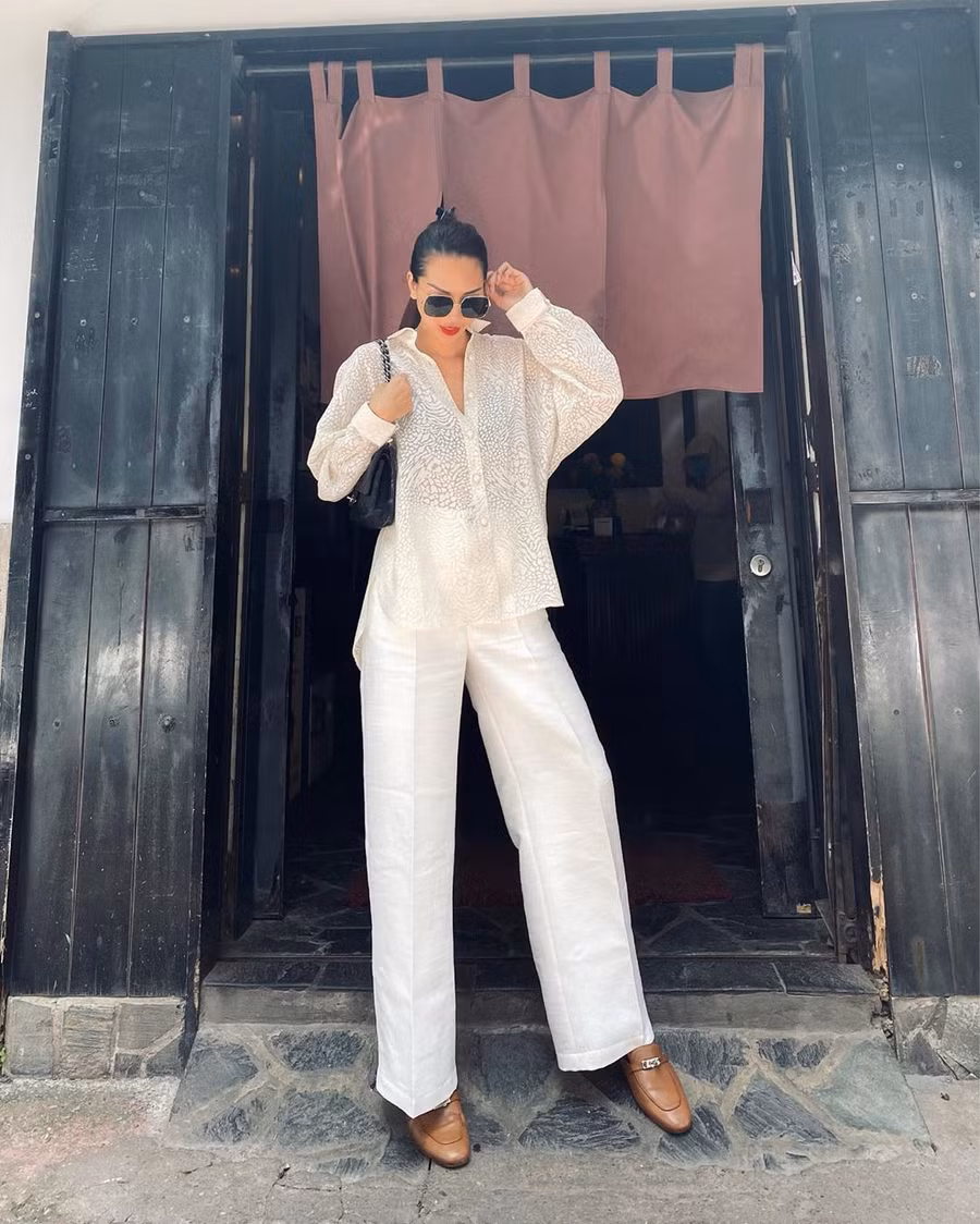 Nửa kia hoàn hảo nhất của quần ống rộng vẫn luôn là áo sơ mi. Cái hay của cặp đôi này chính là bạn có thể ghi điểm thanh lịch tuyệt đối, nhưng vẫn toát lên vẻ phóng khoáng, sành điệu và đôi khi còn hack tuổi hiệu nghiệm nếu bạn chọn áo sơ mi mang gam màu tươi sáng.