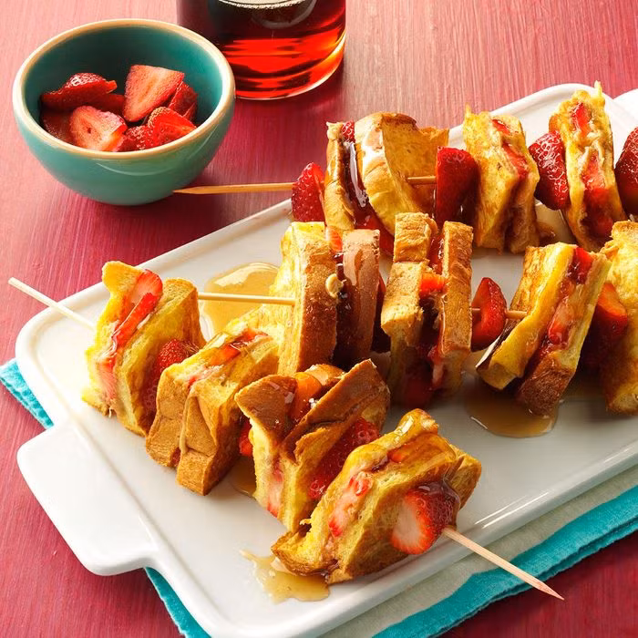 Xiên que lần lượt bánh mì phết mứt dâu, dâu tây thái lát, bánh mì phết bơ đậu phộng.