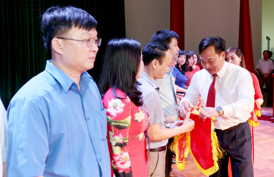 | Đại diện Ban tổ chức tặng cờ lưu niệm cho các đoàn về dự Hội thi |