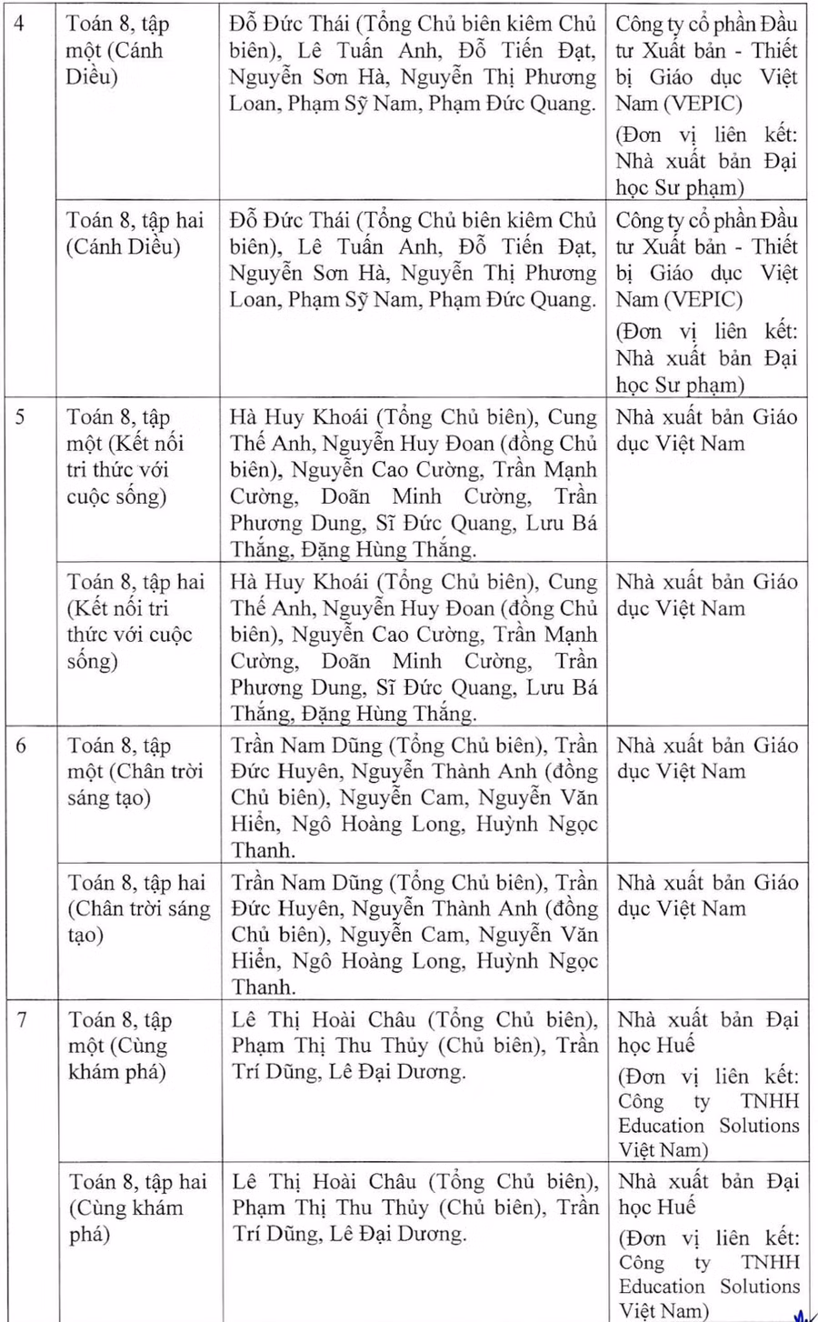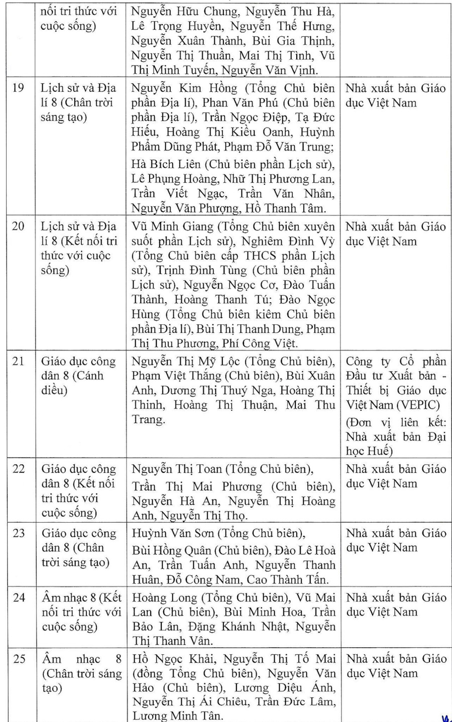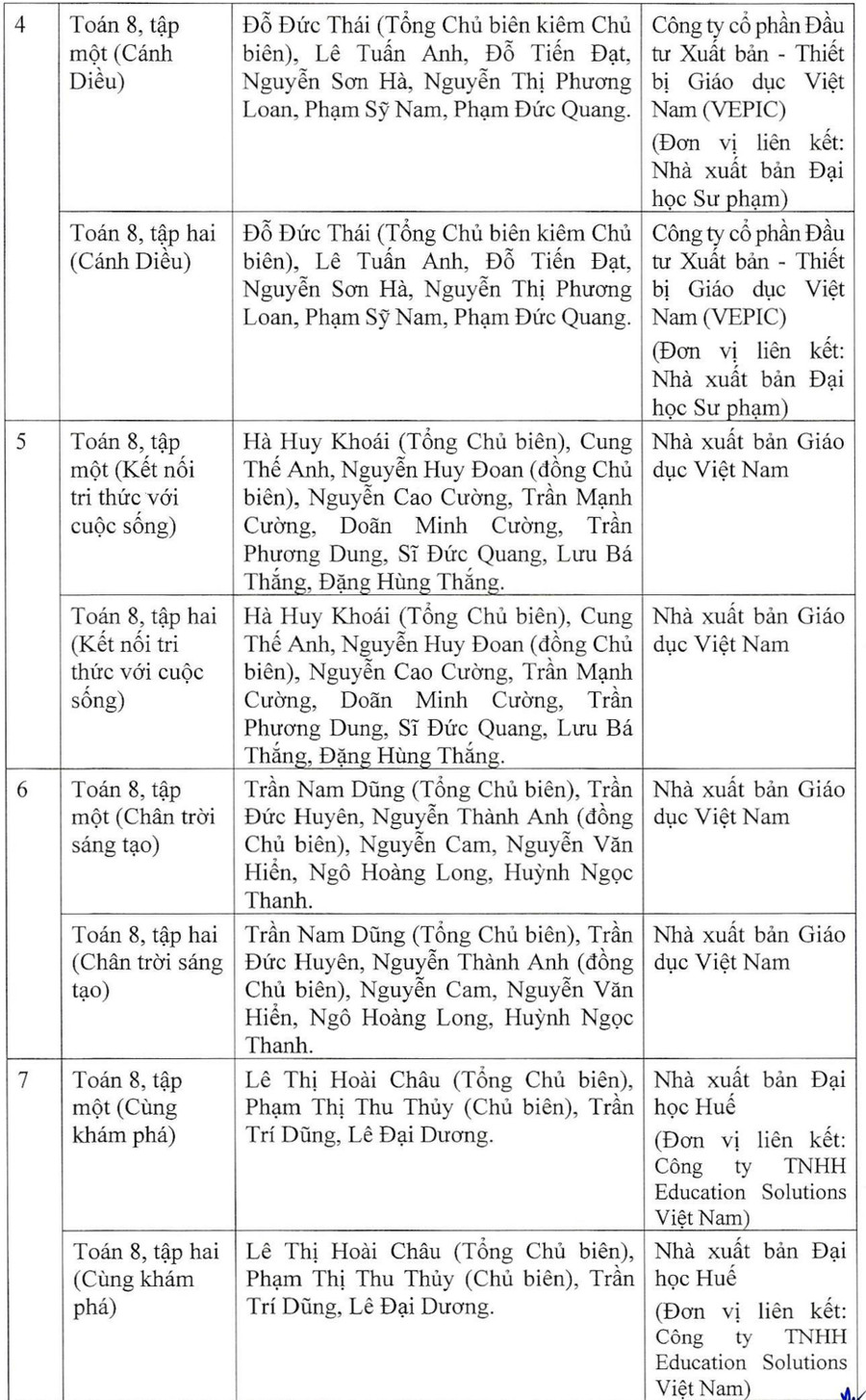 Theo đó, danh mục gồm 42 đầu sách giáo khoa các bộ Cánh Diều, Chân trời sáng tạo, Kết nối tri thức với cuộc sống, Cùng khám phá…