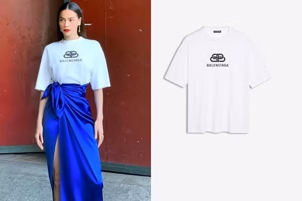 Ngoài Gucci, Hà Hồ còn ưa chuộng hiệu Balenciaga. Cô từng mix chân váy xanh với áo phông trắng của nhà mốt này. Được biết item này có giá £350 (khoảng 10 triệu đồng).
