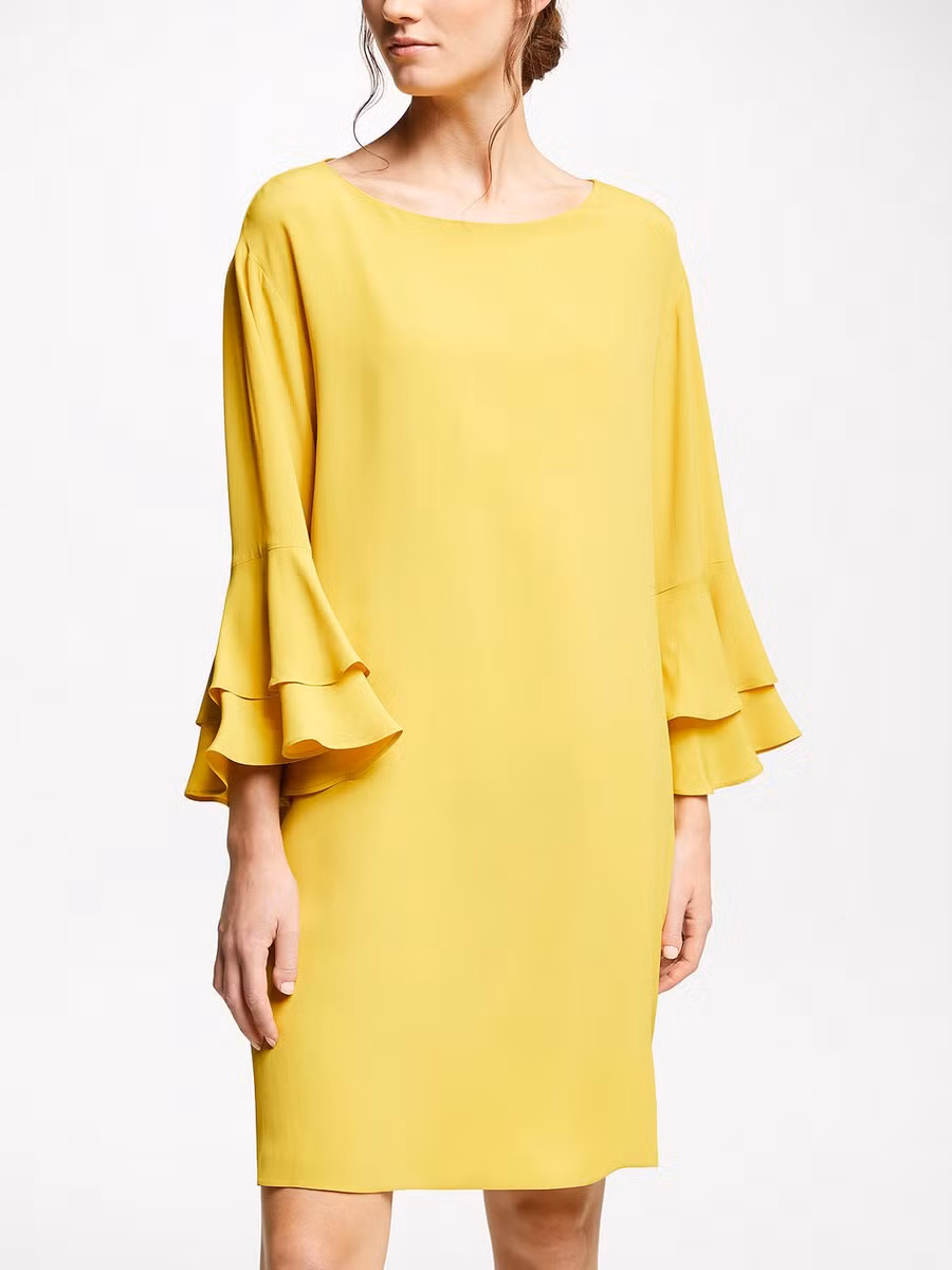 Với màu vàng, bạn có thể chọn những chiếc váy đơn sắc, hoặc có họa tiết nho nhỏ thanh lịch, kết hợp với trang sức nhỏ nhắn, đơn giản để tạo điểm nhấn cho bộ trang phục.