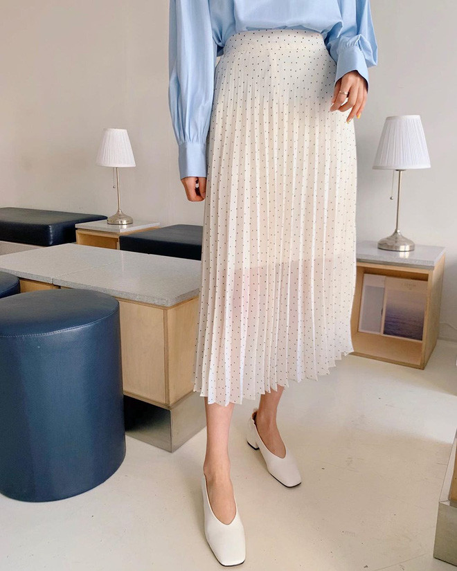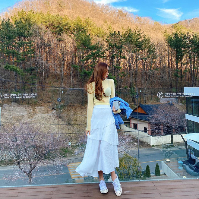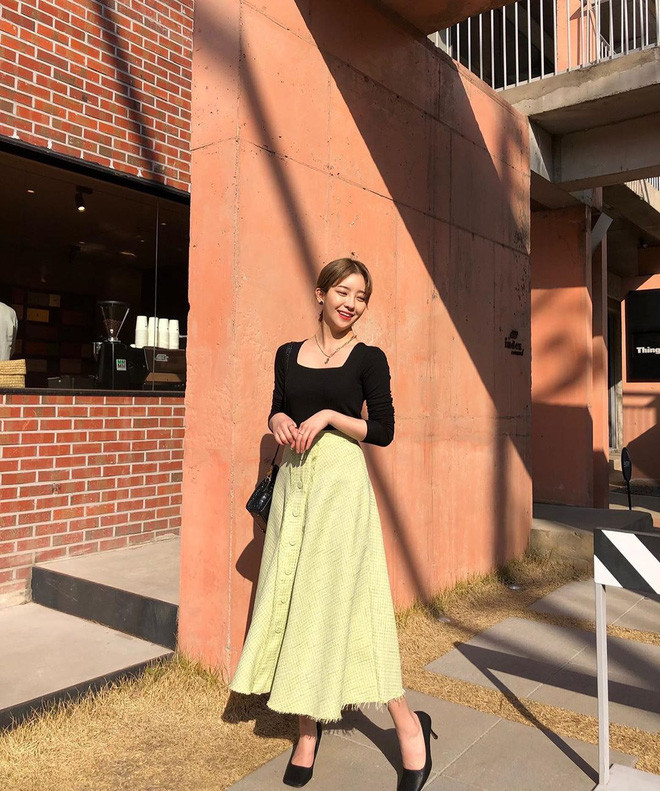 Không nói đâu xa, hội sành mặc xứ kim chi cũng "cuồng" chân váy dài hết nấc, từ mẫu váy xếp ly quen thuộc, đến váy xếp tầng, váy trơn. Đó là còn chưa kể, chân váy midi diện lên là "auto" xinh xẻo, kết hợp với áo blouse, áo phông hay áo ôm đều đẹp hết nút.