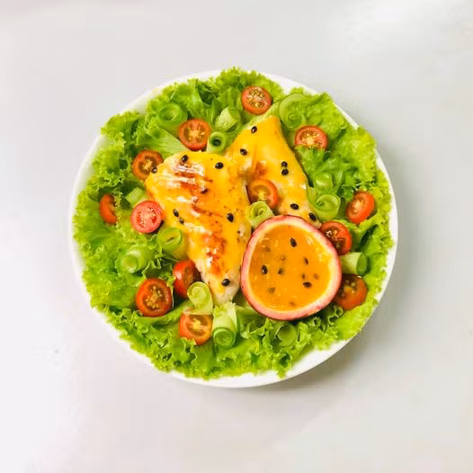 Nguyên liệu: 200g ức gà; 250g dưa leo, xà lách, cà chua bi, 1 quả chanh dây lấy phần thịt, 1 muỗng mật ong, 1 muỗng tương ớt, 3 muỗng nước, 1/2 muỗng bột năng.