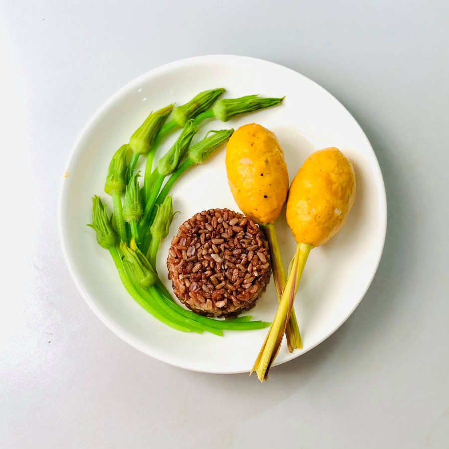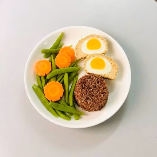 Nguyên liệu: 1 quả trứng, 50g thịt ức gà, 10g bột yến mạch, 10g hành tây, 10g cà rốt.