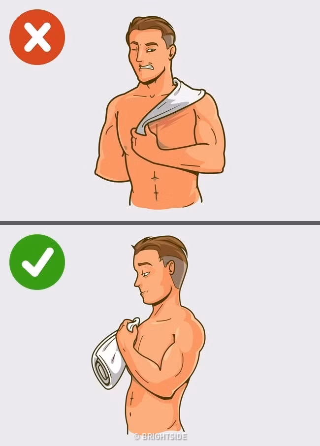 Lau khô quá mức. Sau khi tắm xong, hãy lau khô cơ thể bằng một chiếc khăn mềm và để lại một chút độ ẩm. Sau đó bạn có thể sử dụng loại kem yêu thích của mình, da của bạn sẽ mềm và khỏe mạnh.