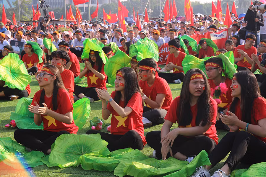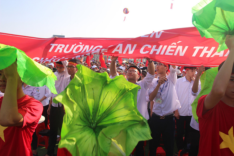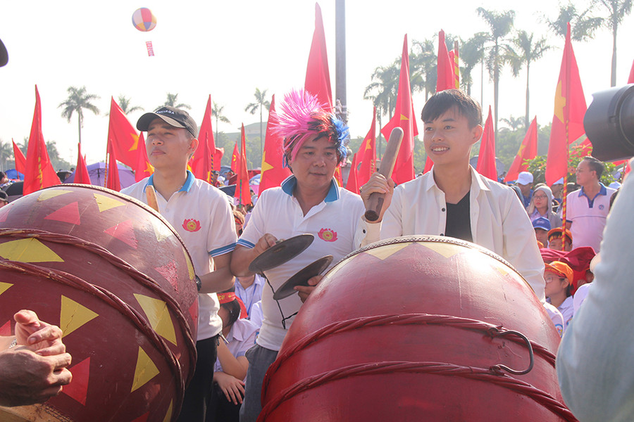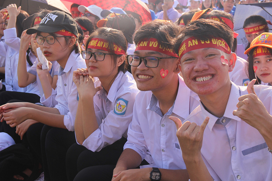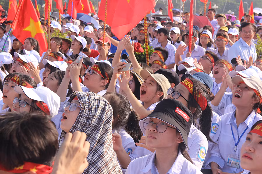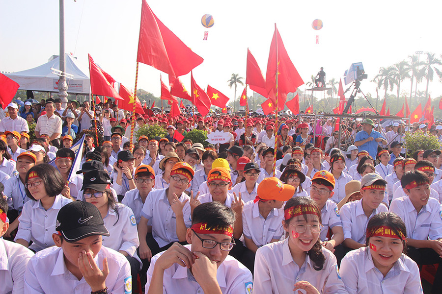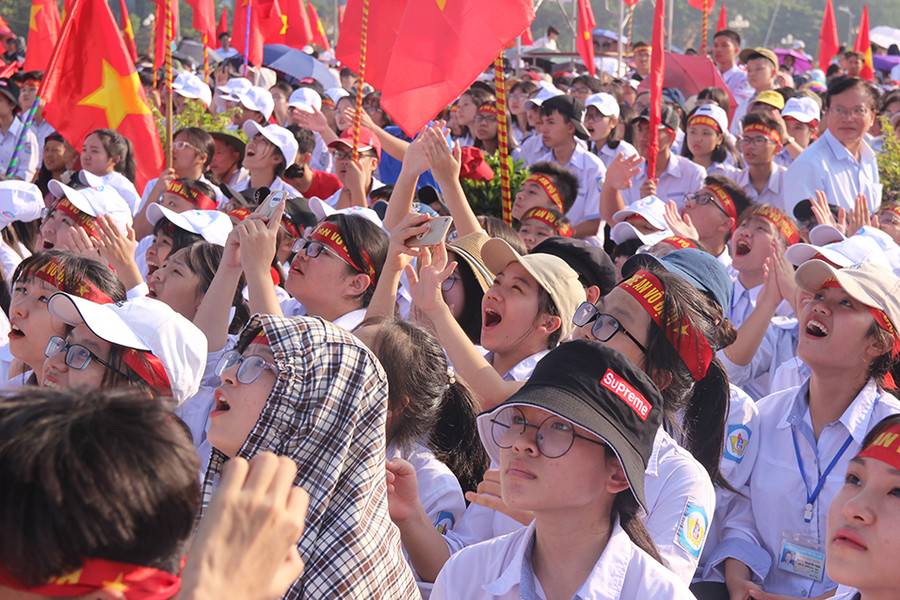 | Đông đảo học sinh tập trung về Quảng trường Hồ Chí Minh với cờ hoa, băng rôn khẩu hiệu... |