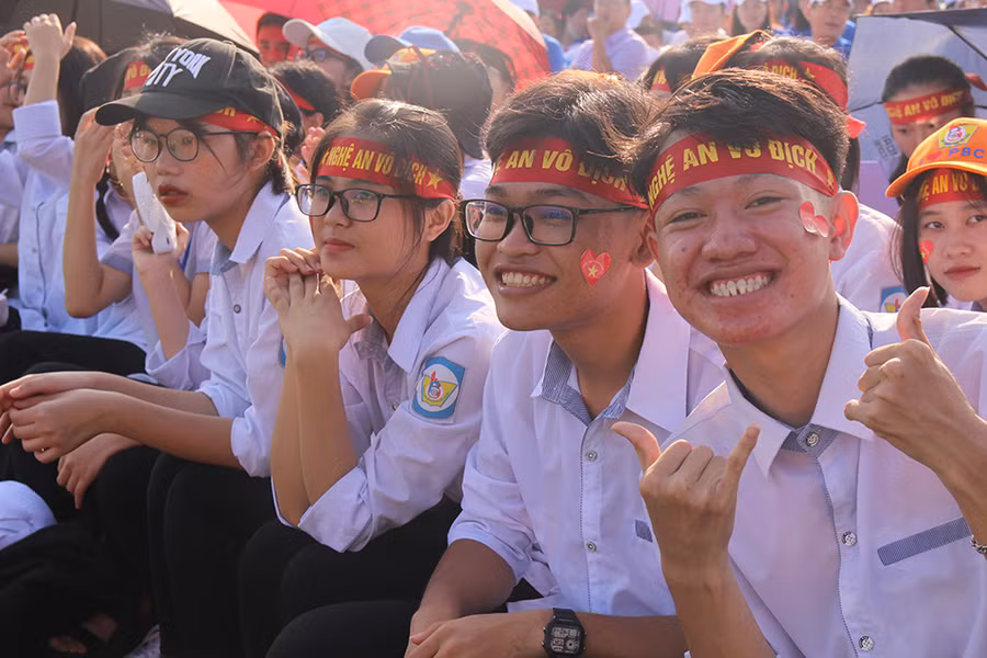 Dù thời tiết nắng nóng gay gắt, nhưng các cổ động viên vẫn có mặt đông đủ, chuẩn bị băng rôn, cờ và các khẩu hiệu “quyết chiến, quyết thắng”, chuẩn bị màn nhảy flashmob ấn tượng để làm nóng không khí đầu cầu Nghệ An. Các bạn học sinh lớp 12A3 Trường THPT chuyên Phan Bội Châu còn chuẩn bị nhiều món quà đặc biệt dành cho cậu bạn.