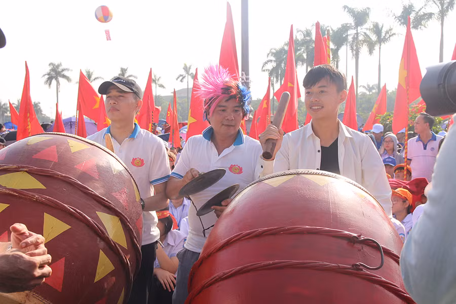 Hình ảnh không khí cổ vũ cho nhà leo núi Trần Thế Trung tại đầu cầu Nghệ An:
