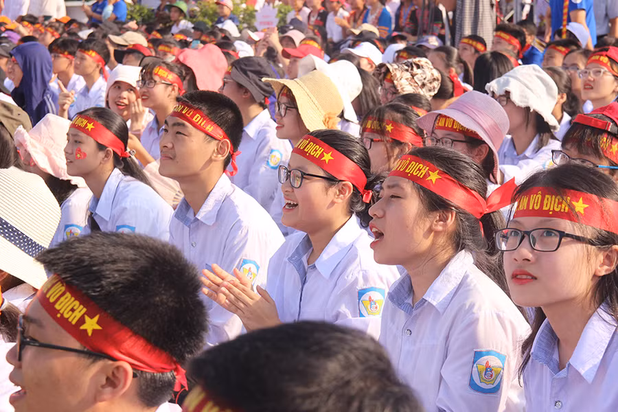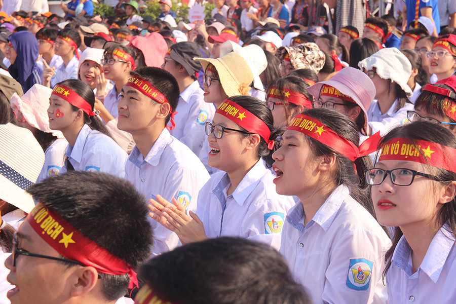 Để có đủ không gian rộng lớn cho tất cả học sinh, người dân đến cổ vũ cho Trần Thế Trung tại chung kết Đường lên đỉnh Olympia, điểm cầu Nghệ An được tổ chức tại Quảng trường Hồ Chí Minh, ngay phía trước tượng đài Bác.
