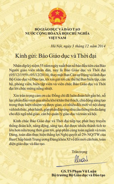 Nhân dịp kỷ niệm 55 năm ngày xuất bản số báo đầu tiên của Báo Người giáo viên nhân dân, nay là Báo Giáo dục và Thời đại (05/12/1959 – 05/12/2014), thay mặt Ban Cán sự Đảng và lãnh đạo Bộ Giáo dục và Đào tạo, tôi xin gửi tới các thế hệ Ban biên tập, cán bộ, phóng viên, biên tập viên và viên chức Báo Giáo dục và Thời đại lời chúc mừng nồng nhiệt.