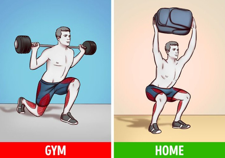 Thanh tạ đòn có bán lẻ theo từng trọng lượng khác nhau tại các cửa hàng dụng cụ thể thao nhằm phục vụ cho việc tập luyện ở nhà. Hoặc không, hãy lắp đầy chiếc balo và sử dụng nó để tập squat hay lunge. Ảnh: Bright Side.