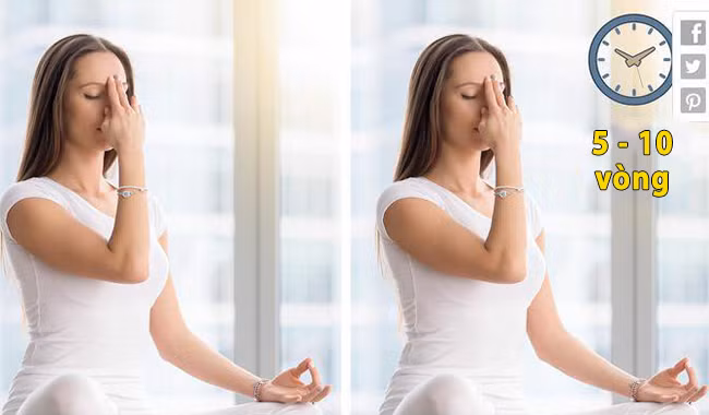 Tiếp tục, nhấn lỗ mũi trái và thở ra qua lỗ mũi phải. Sau đó hít vào qua lỗ mũi phải lần nữa. Những chuyển động này tạo ra một chu kỳ hít thở đều đặn. Làm 5 đến 10 lần như vậy là hoàn thành.