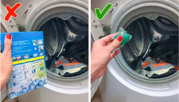 Bạn nên dùng nước giặt giày thay cho bột giặt. Giày nên giặt ở chế độ đặc biệt với nhiệt độ không quá 30 độ C.