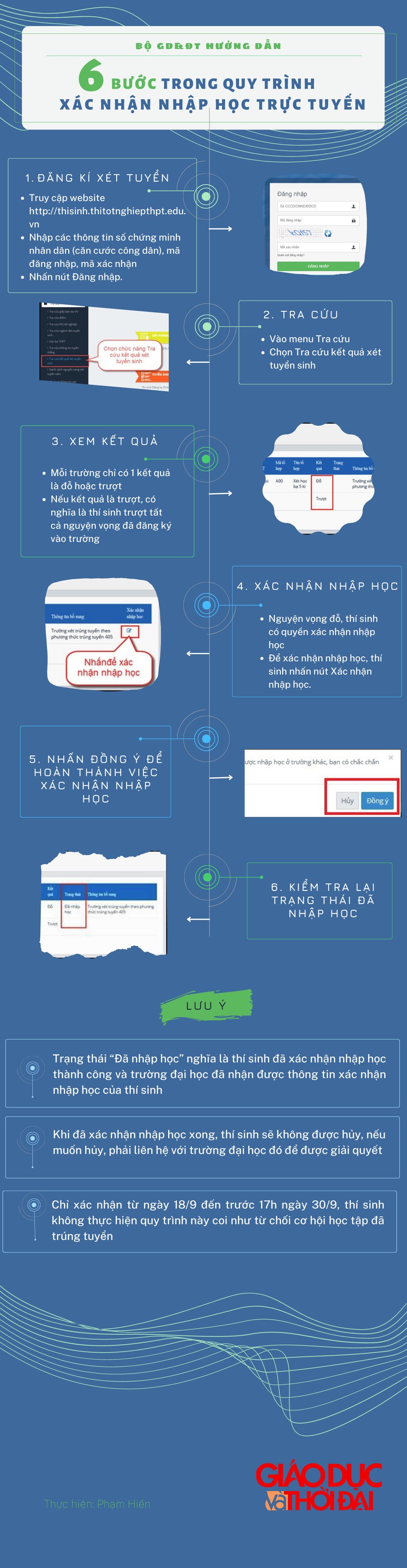 GD&TĐ - Từ 18/9 đến 17 giờ 00 ngày 30/9, Hệ thống xác nhận nhập học trực tuyến sẽ được mở. Thí sinh sẽ thực hiện 6 bước trong quy trình xác nhận nhập học.