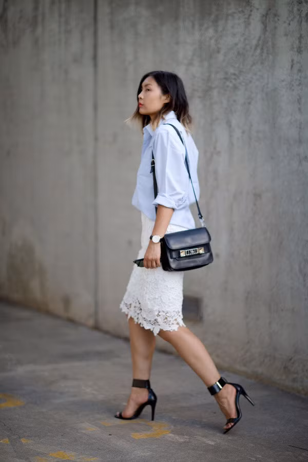 Sự mềm mại, quyến rũ của chân váy ren khi kết hợp cùng những chiếc sơ mi đứng dáng sẽ khiến bạn trông "lạ lẫm" nhưng vô cùng cá tính và sành điệu.