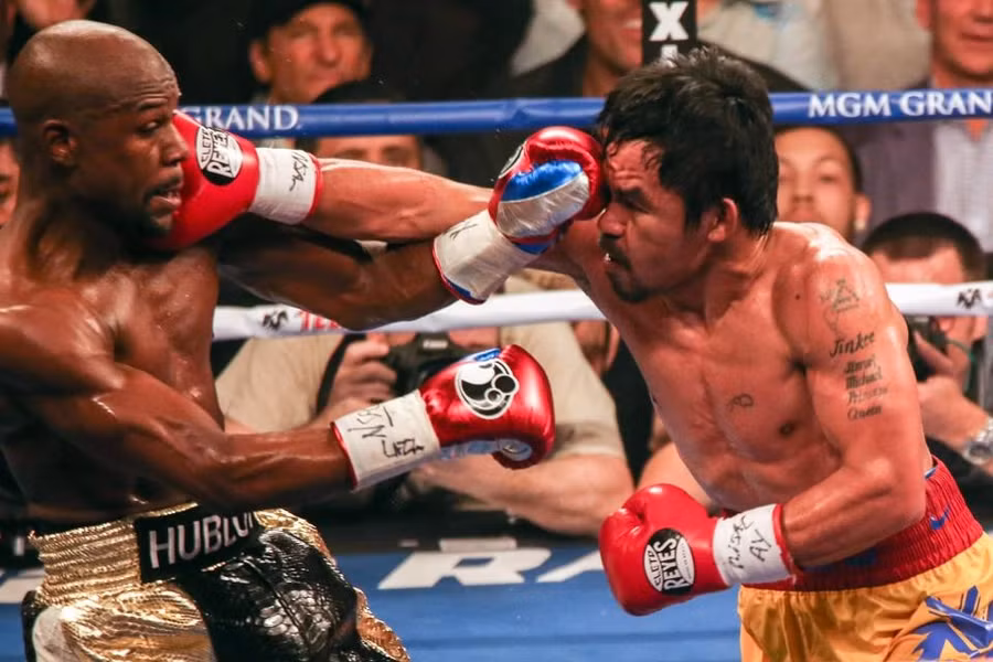 | Mayweather - Pacquiao (852.7 triệu USD, tháng 5/2015). Đây được xem là "Cuộc chiến của thế kỷ" khi hai võ sĩ là người nắm giữ kỷ lục hàng đầu của làng quyền anh. Tiền thu về từ truyền hình là 419.2 triệu USD, tiền bán vé là 73.9 triệu USD. Thù lao của Mayweather là 281.3 triệu USD, trong khi huyền thoại người Philippines nhận được 153.6 triệu USD. |