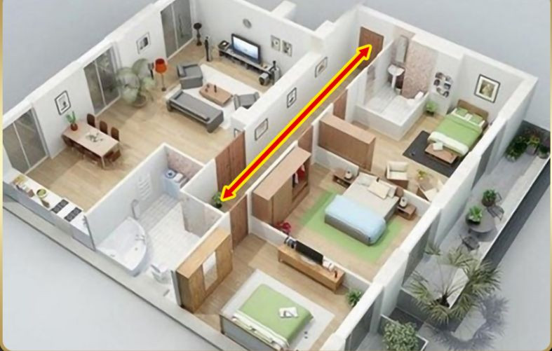 Đây là một trong những lỗi phong thủy nhà ở nặng nhất, thuộc về “Tam kiến môn” (ba lỗi kiêng kỵ với cửa chính): Chỉ việc mở cửa chính ra có thể nhìn thấy nhà vệ sinh, bếp nấu hay gương trong nhà.