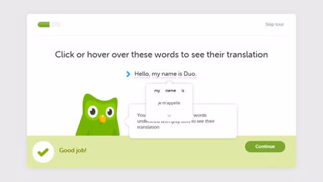 Giao diện của nó cũng rất trực quan và dễ sử dụng. Duolingo cũng không có quảng cáo làm phiền bởi nó kiếm tiền bằng cách sử dụng một số kỹ năng ngôn ngữ của bạn để bán các bản dịch thuật cho các doanh nghiệp.