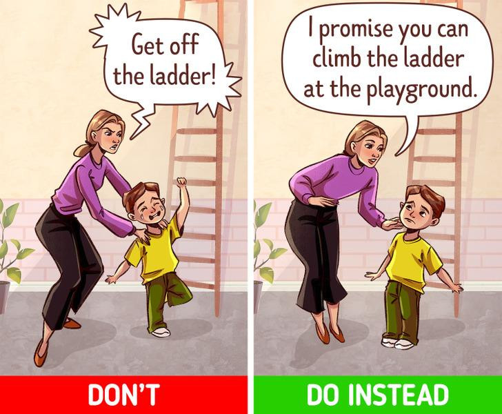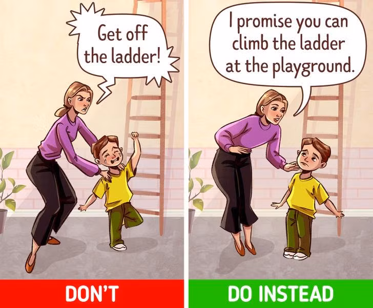 Vì vậy, thay vì la mắng, cấm trẻ không được làm, bạn có thể đưa ra một giải pháp thay thế tương tự, đó sẽ là mục tiêu mới để trẻ đạt được. Đó có thể là một phiên bản an toàn hơn của những gì con muốn làm và bạn có thể lên kế hoạch cho hoạt động mới này để con hào hứng.