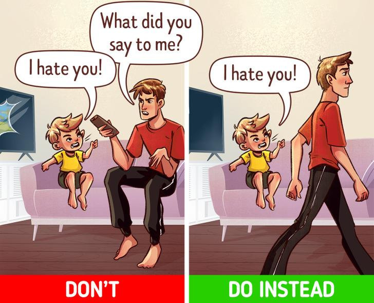 Và mặc dù điều này có thể khiến bạn dễ bị xúc phạm gây mất bình tĩnh nhưng đây rõ ràng là một nước đi sai lầm. Thực tế, trẻ nhiều khi sẽ không có suy nghĩ như những gì chúng nói, mà đó chỉ là cách để thể hiện sự thất vọng và mong bạn hiểu cảm xúc của trẻ.
