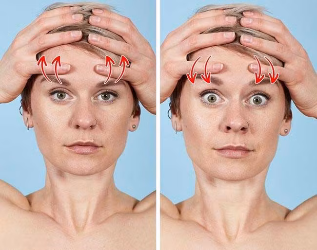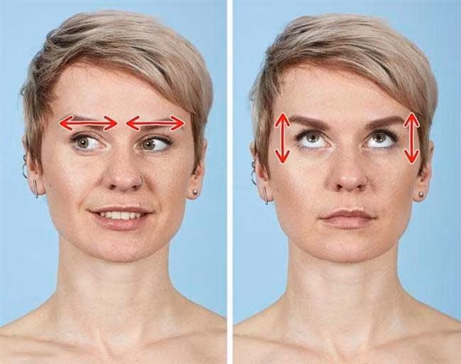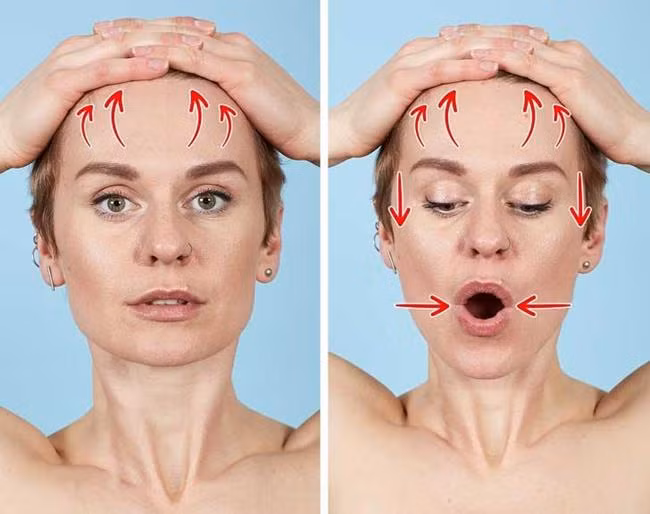 – Tiếp đó, dùng lực kéo đầu trên lên, đồng thời chân mày căng ra như đang tỏ thái độ ngạc nhiên. Lưu ý, trong khi tập, nhất định không được nhăn da vùng trán.