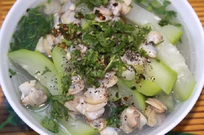 Nghêu kết hợp với bầu trong cùng một tô canh vừa mát, bổ, chữa ho, cảm cúm vừa kích thích vị giác, giúp ăn uống ngon miệng hơn.