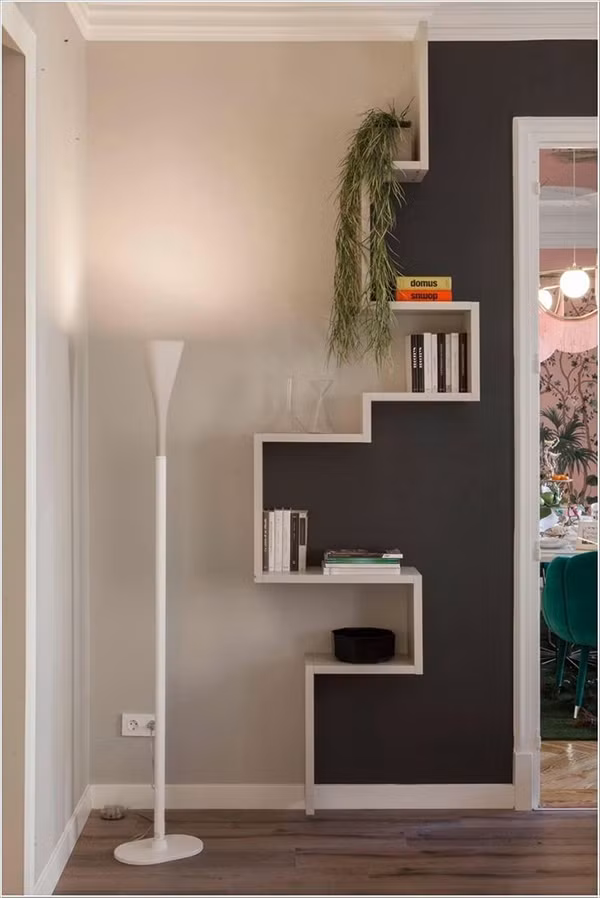 Ngoài ra, bạn cần tận dụng những bức tường trống và biến nó thành không gian để đồ đạc thật độc đáo. Đó có thể là nơi để sách, vật lưu niệm hoặc bất kỳ thứ gì bạn muốn. Việc sử dụng màu sắc phù hợp sẽ giúp bức tường thật nổi bật.
