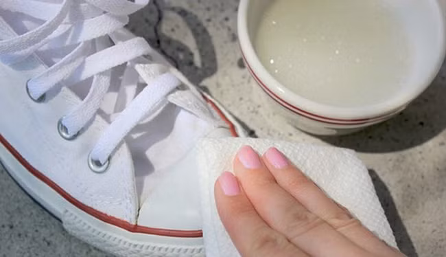 Cho 2 phần baking soda, 3 phần giấm rồi hòa lẫn với nhau cho đều. Sau đó húng bàn chải đánh răng vào hỗn hợp rồi chà vào bề mặt giày. Cuối cùng giặt lại giày dưới vòi nước rồi phơi dưới nắng cho khô.