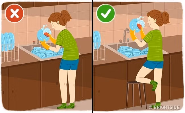Cách phòng tránh: Để một chiếc ghế nhỏ dưới đầu gối khi bạn rửa bát để giảm bớt áp lực.