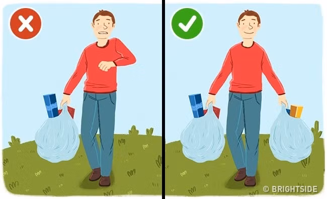 Luôn nhớ rằng bạn nên mang các túi khi mà trọng lượng của chúng được cân bằng ở 2 tay của bạn.