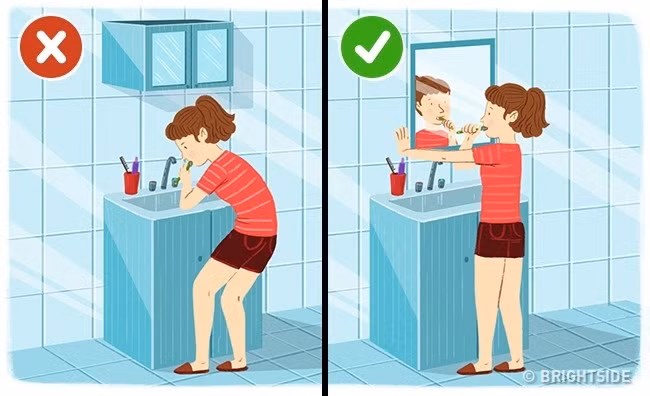 8. Đánh răng. Khi chúng ta đứng, áp lực đè lên cột sống nhiều hơn rất nhiều so với việc đi bộ một quãng đường dài. Nếu bạn phải đứng hàng giờ mỗi ngày thì nên tìm cách giảm thiểu ảnh hưởng xấu lên cột sống.