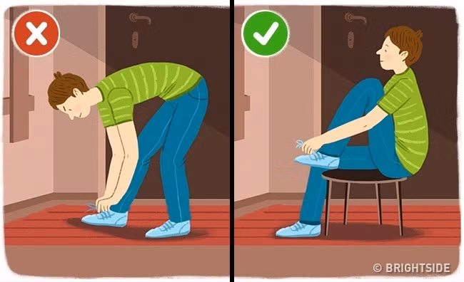 3. Buộc dây giày. Mọi việc chúng ta làm trong tư thế cúi người đều gây hại tới các đĩa đệm. Do vậy, chúng ta nên để ý cảm giác ở lưng trong hoạt động hàng ngày và không nên thử thách nó bằng áp lực.