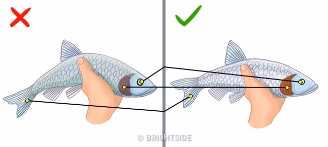 Cá tươi luôn có vảy sáng và mắt trong. Hãy cầm 1 con cá lên và quan sát kĩ, cá ươn thì đuôi của nó thường hạ xuống yếu ớt, vây khô và mang xám thay vì có màu đỏ tươi.