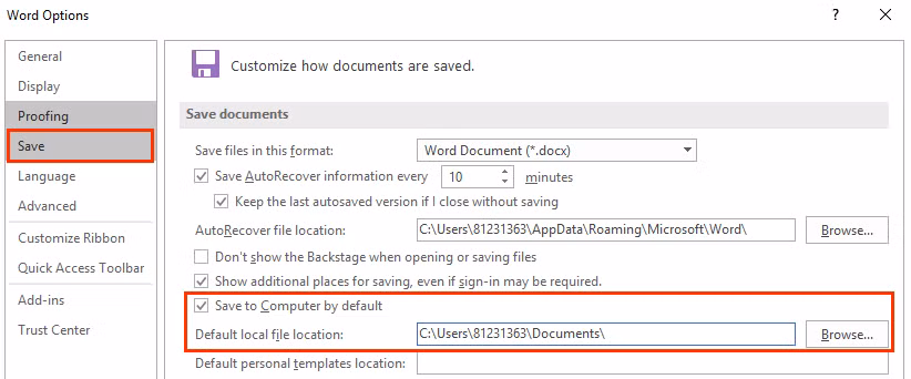 Nếu bạn thường xuyên lưu file của mình vào cùng một vị trí, bạn nên sửa đường dẫn lưu file mặc định của Office. Để làm vậy, bạn vào File > Options > Save và tìm đến nhóm Save documents.