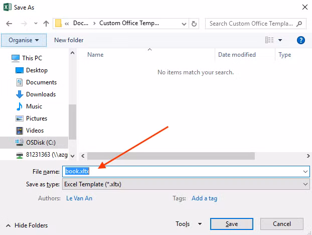 Vào File > Save as, đặt tên cho file Excel là book và tại trình đơn xổ xuống Save as type, bạn chọn Excel Template. Bây giờ, bạn duyệt đến đường dẫn thư mục khởi động của Excel bạn tìm được ở trên và lưu file Excel Template vào đó. Tất cả các bảng tính Excel mới bạn đều sẽ sử dụng Template này.