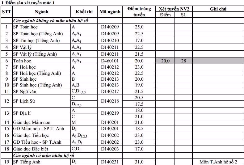 | 1 | C140209 | Sư phạm Toán (Toán - Lý) | A | 10,0 |