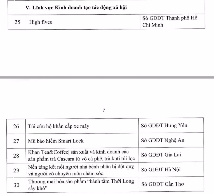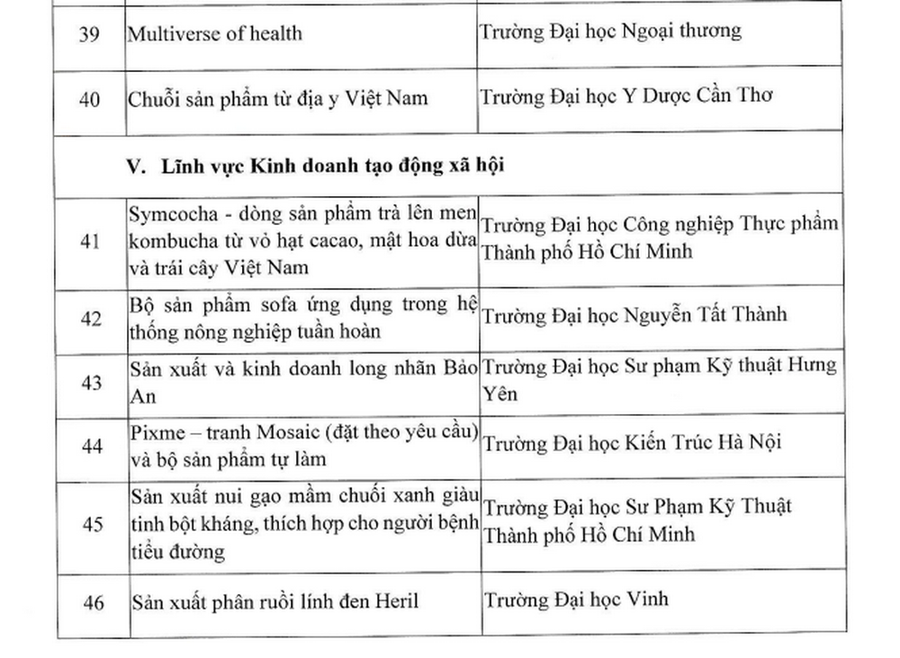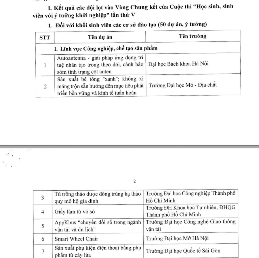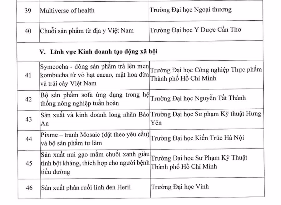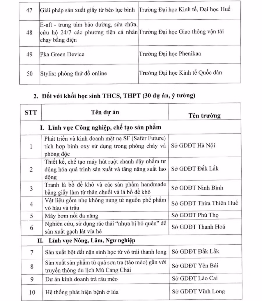 Theo kết quả công bố của Bộ GD&ĐT, có 50 dự án, ý tưởng của sinh viên và 30 dự án, ý tưởng của học sinh THCS, THPT được lọt vào vòng chung kết Cuộc thi “Học sinh, sinh viên với ý tưởng khởi nghiệp” lần thứ V.