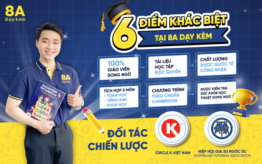 Chuyên về toán học song ngữ, khoa học và các chương trình dạy kèm tiếng Anh theo tiêu chuẩn học tập quốc tế và chương trình giáo dục Việt Nam, 8A Dạy kèm là trung tâm Việt Nam duy nhất được Hiệp hội Gia sư Úc ATA (Australian Tutoring Association) cấp chứng chỉ dạy kèm được công nhận trên toàn thế giới cho tất cả giáo viên.