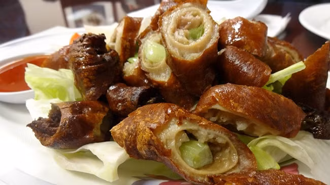5, Hành lá rửa sạch, thái nhỏ. Đổ dầu ăn đang sôi vào bát hành lá thái sẵn để hành chín, sau đó phết lên cá nướng cuốn bánh tráng.