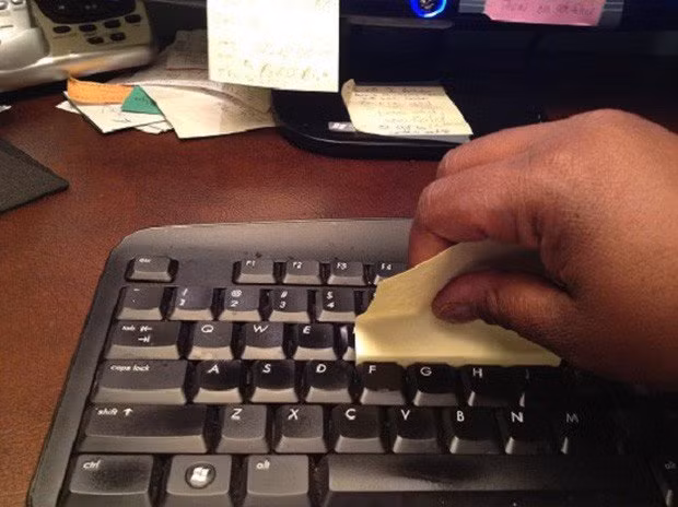 Giấy ghi chú, hay còn gọi là giấy note có một phần keo dính phía trên, bạn có thể tận dụng phần keo này để lôi những tên bụi bẩn ẩn trốn trong các kẽ bàn phím.