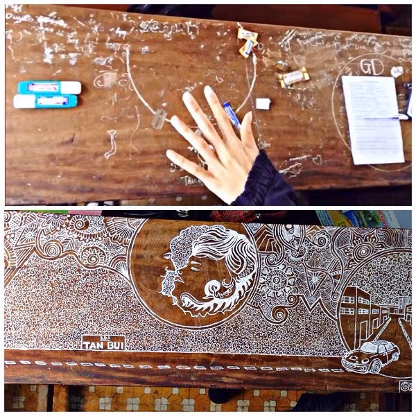 9X tâm sự để hoàn thành tác phẩm, cậu tranh thủ vẽ trong giờ ra chơi. Tấn chỉ vẽ lên những chiếc bàn đã cũ và bẩn, trước khi vẽ phải dùng giấy ráp làm sạch mặt bàn.