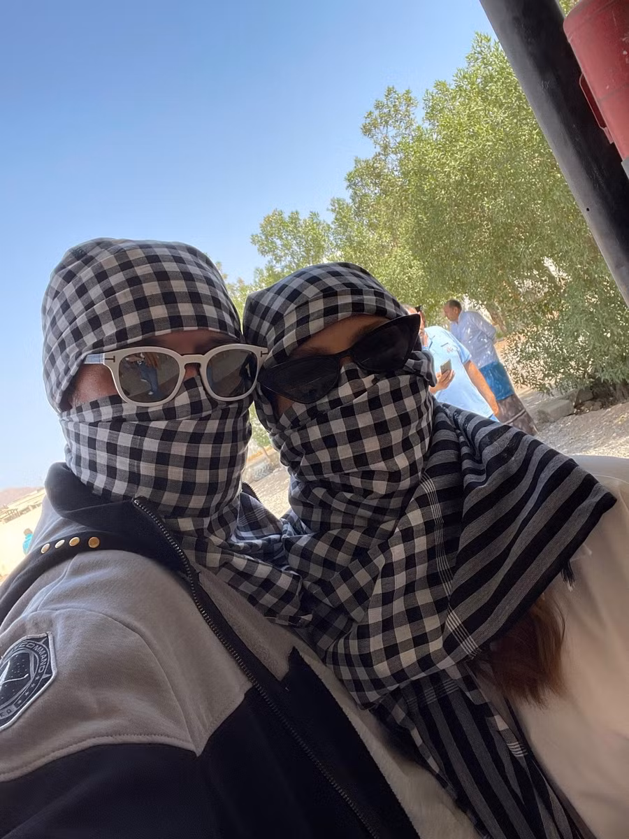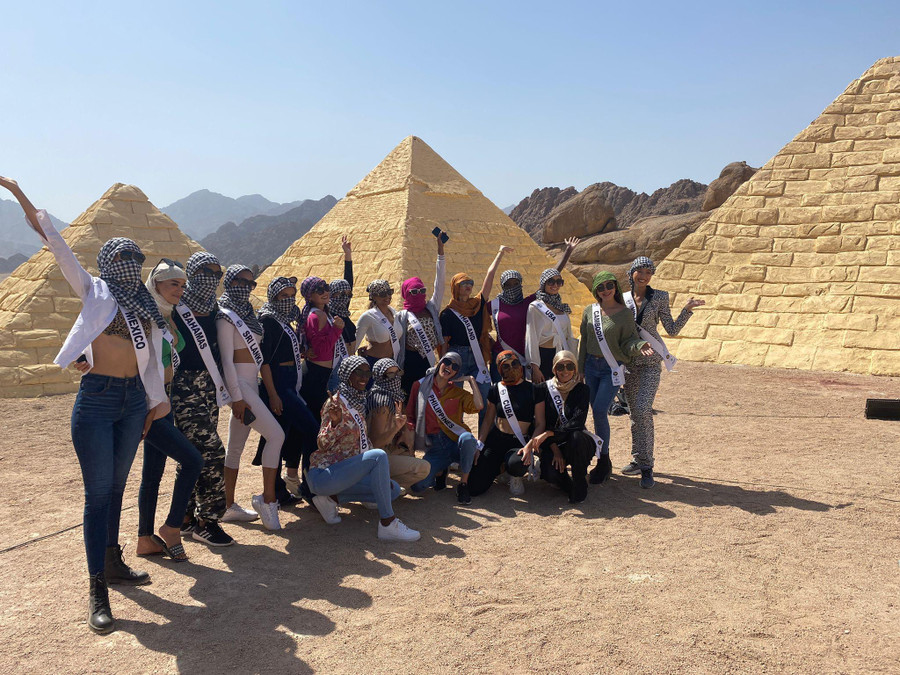 Trong chuyến tham quan lần này tại kim tự tháp Ai Cập, Bảo Ngọc cùng các bạn xúng xính đội khăn rằn tạo nên một hình ảnh vô cùng thú vị cho chuyến đi.