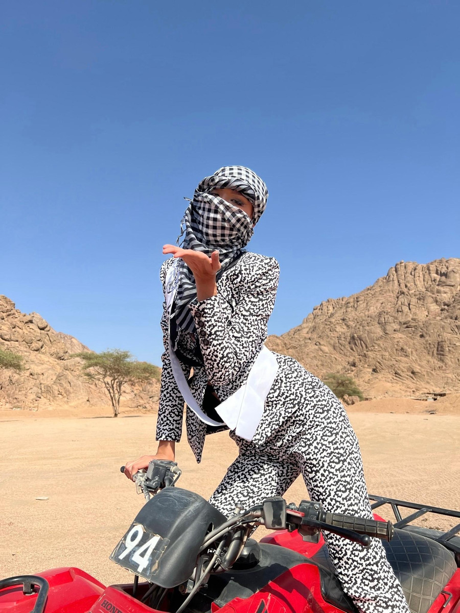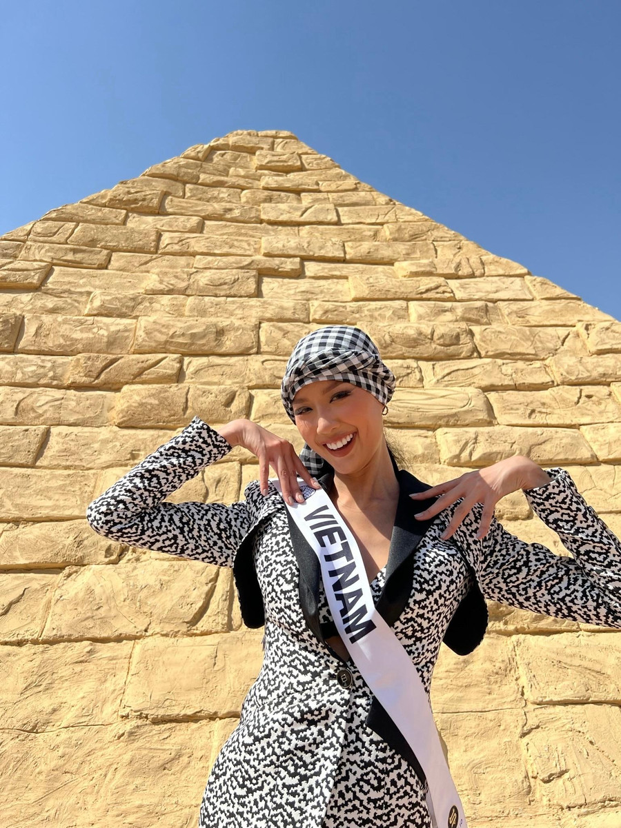 Chưa kể đến, nàng hậu của chúng ta còn diện cho mình một bộ outfit cùng tone màu với chiếc khăn rằn hóa thân gái Cần Thơ để đến Ai Cập.