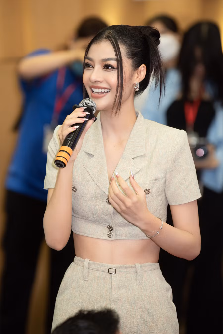 Trong khi Hoa hậu Thiên Ân và Á hậu Ngọc Hằng diện đầm kiểu dáng công sở kín đáo, nhẹ nhàng thì Á hậu Kiều Loan đã tinh tế khoe vòng eo thon thả qua bộ trang phục màu be cá tính. Chiếc áo croptop thanh lịch nhưng vẫn khéo léo để lộ đường cong 60cm của cô nàng Á hậu xứ Quảng đa tài này.
