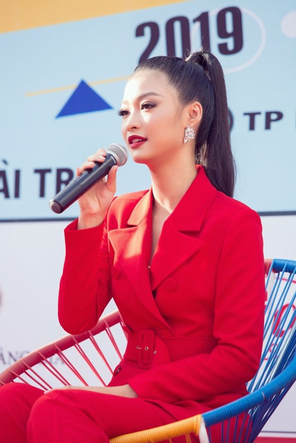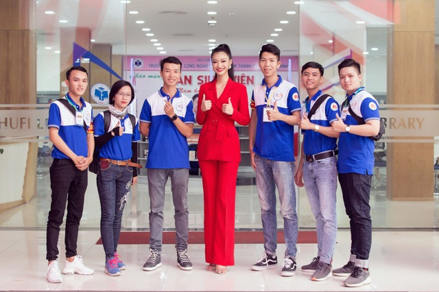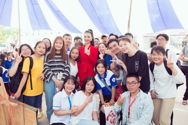 Thầy cô cũng như các bạn sinh viên Quảng Nam đều bất ngờ trước nhan sắc ‘đậm đà’ của nàng Á hậu sinh năm 2000 trong bộ vest đỏ cá tính. Kiều Loan cũng nhận được sự chào đón nhiệt tình từ các bạn sinh viên trong hội đồng hương.