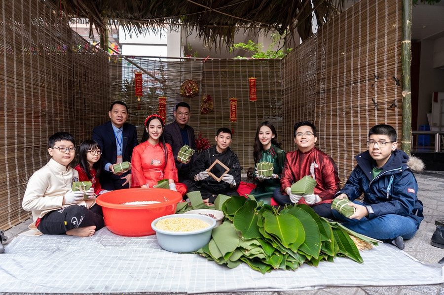 | Á hậu Trịnh Thùy Linh và Ngọc Hằng tự tay gói bánh chưng cho các em nhỏ vùng cao. |