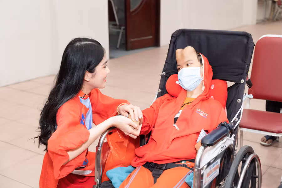 Ngoài nghĩa cử cao đẹp, Á hậu Phương Anh còn ghi điểm bởi hành động tinh tế khi nhiệt tình hỗ trợ một em bé gặp biến chứng ở chân gặp khó khăn khi di chuyển tại chương trình.
