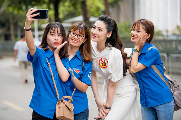 | Á hậu nhận lời làm giám khảo cuộc thi học sinh thanh lịch của Đại học Kinh tế Quốc dân. |